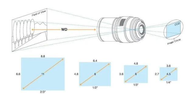其次,確定所要達到的視野范圍(FOV)和工作距離(WD),然后根據這兩個要求和已知的靶面尺寸計算出工業鏡頭的焦距(f)。其計算公式為: